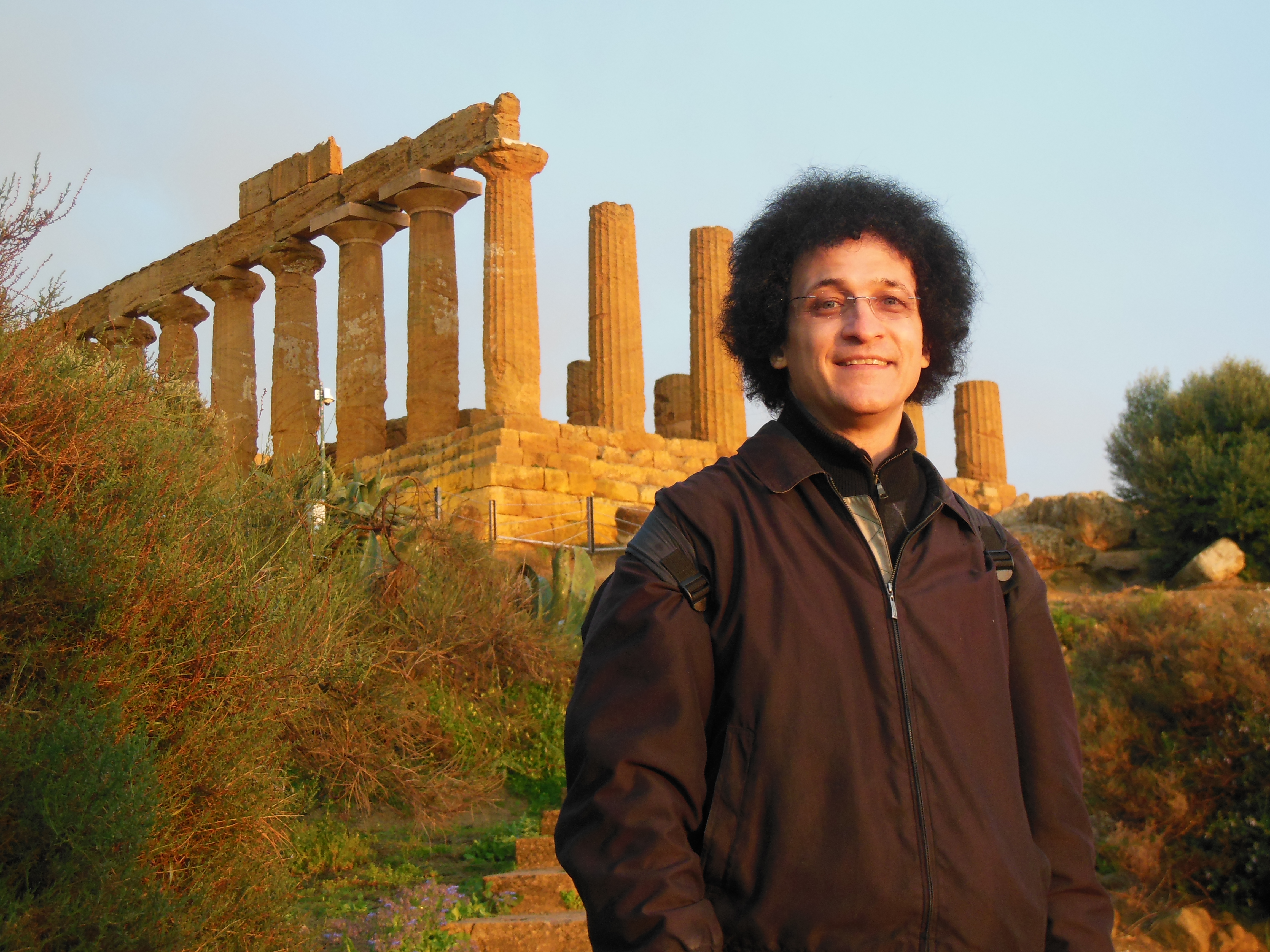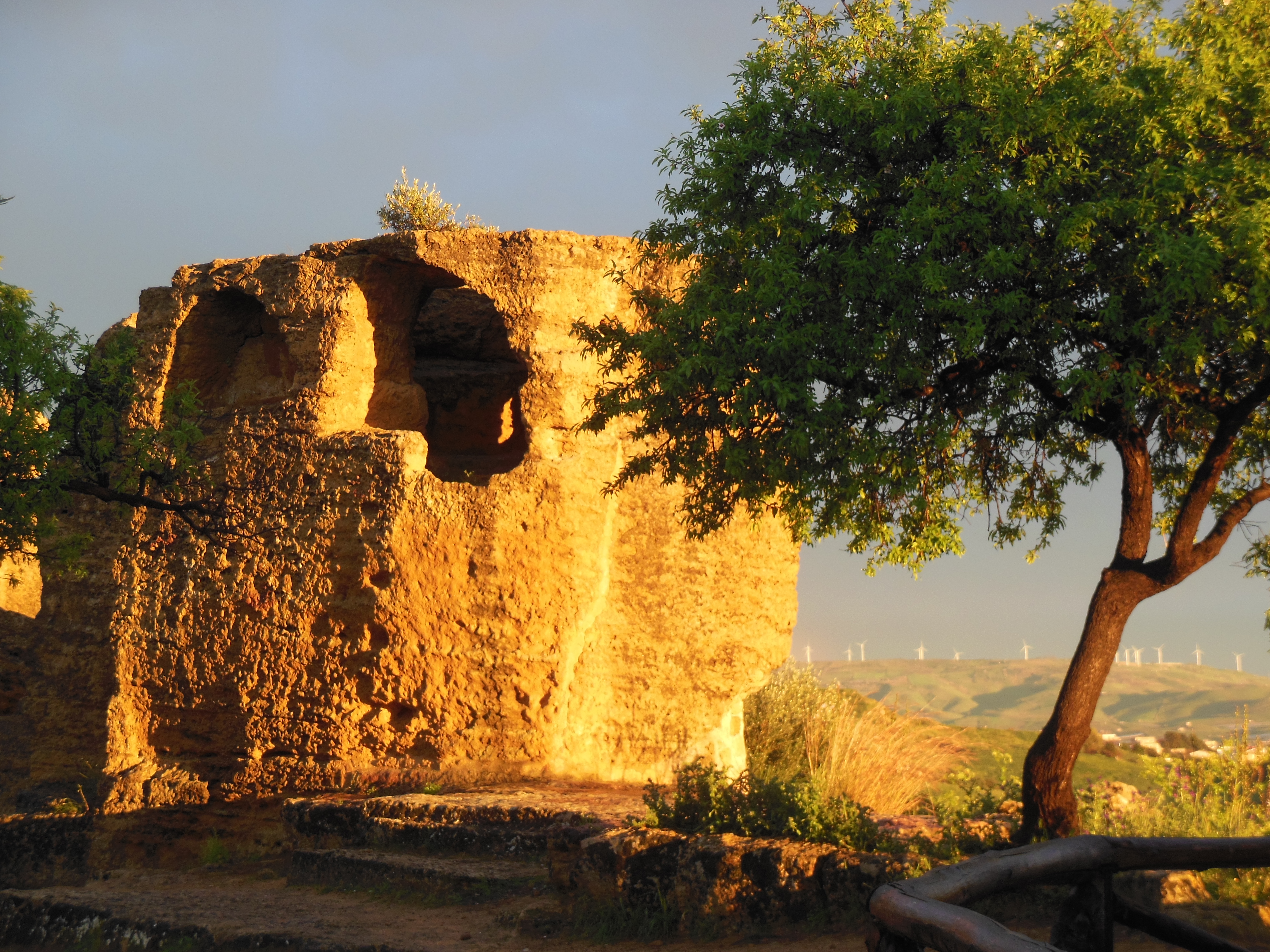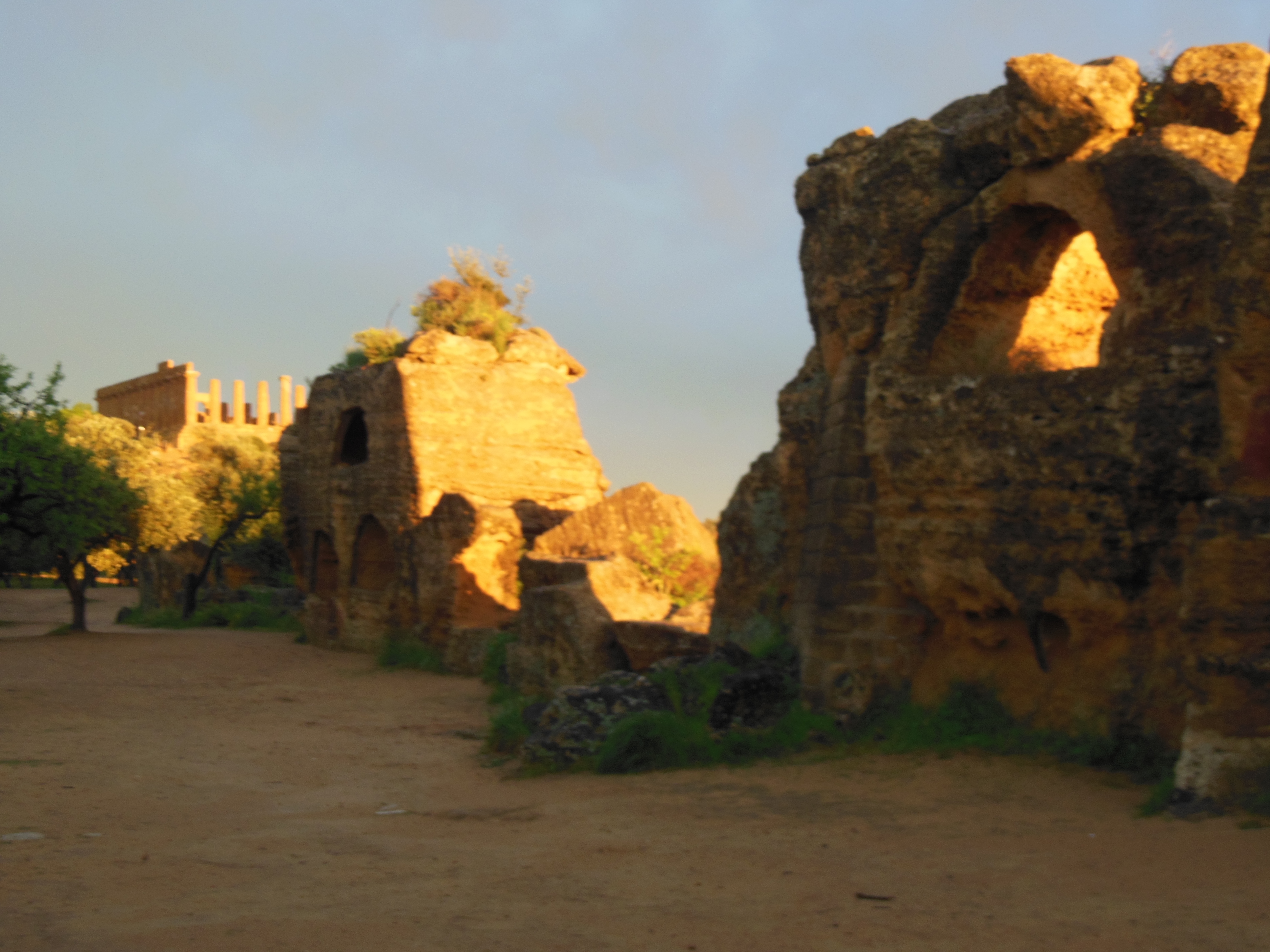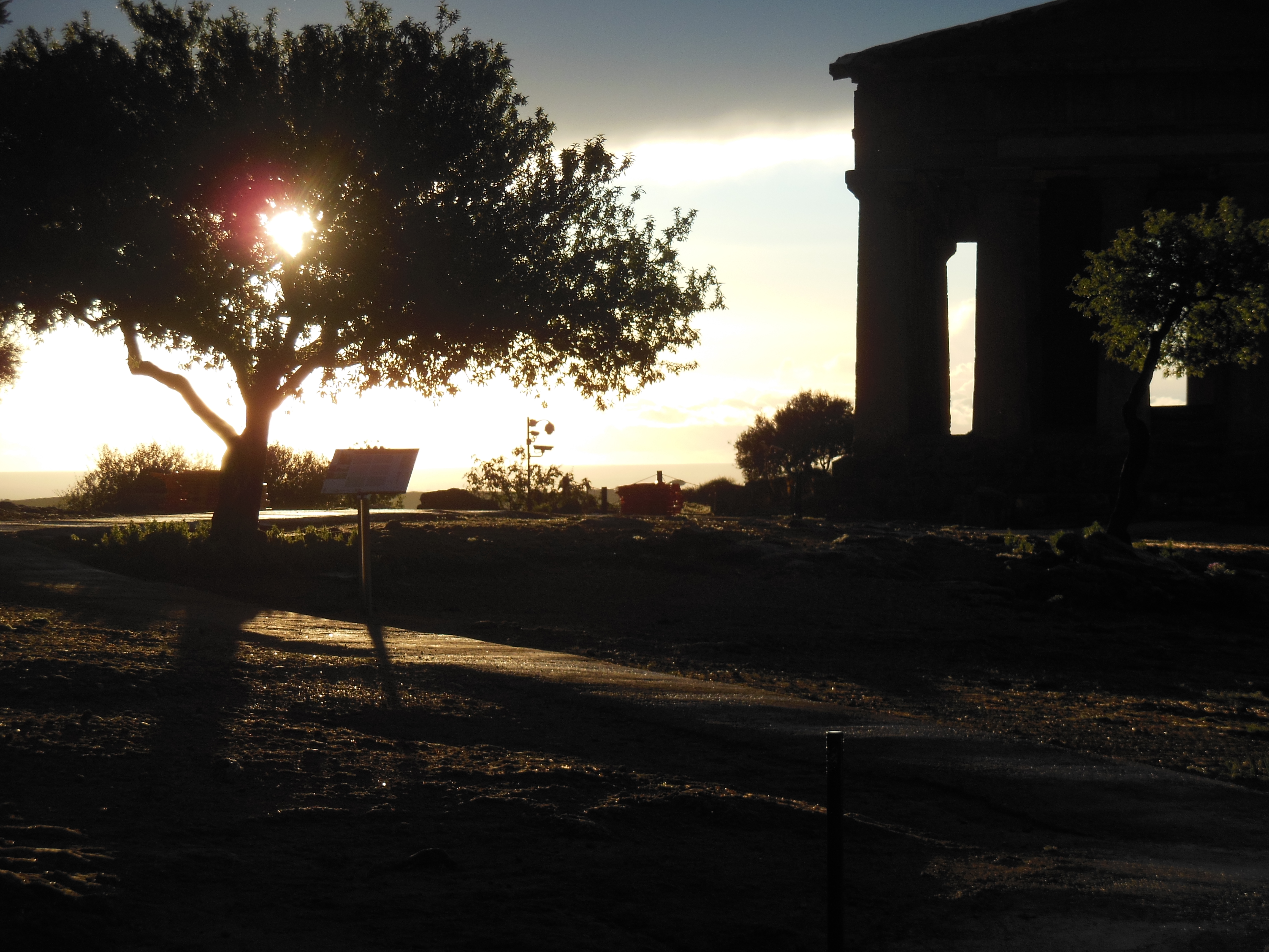 We arrived at the Valley of Temples in Agrigento, Southern Sicily, near opening time, and were still walking around late afternoon when a heavy rain drove us under a temporary shelter. We waited it out reading a history of the Temples. When the rain cleared we said, why not one more picnic at the Temple of Concord? There we were, munching a can of barlotti beans, when the sun started to set. The temple turned amber and raindrops fell off the ancient olive trees. I said something intelligent, like “GAH! THE LIGHT!”