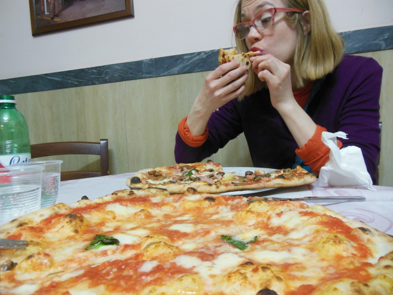 Our 8 1/2 hour train ride from Siracuse to Naples cost €9 each. We left our seaside hotel in Syracuse in a sleepy morning light with a few other passengers. The dramatic landscape of sea and orange rocks and wildflowers out our window was spectacular and with each stop the train was becoming more and more full. We had assigned seats at table and soon a young couple sat across from us. It was a tight fit and we had to constantly maneuver to keep our knees from rubbing up against our companions. The couple didn’t seem to mind, since they were occupied with making out, in my estimate, for about seven hours straight. (And by making out, I mean they were really going at it….further details omitted in the interest of discretion). The passing landscape grew even more fabulous until, OMG, there was Mt. Etna belching cold smoke on our left! By the time we left Sicily through Straight of Messina, every seat was full (we counted 80 people in our car, plus a beagle and a surprisingly mellow calico cat.) As if choreographed, the passengers simultaneously pulled out foil-wrapped ham sandwiches and, after finishing them, went to sleep. (As soon as the entire car was asleep, we realized our grave error of packing canned tuna fish for lunch–we couldn’t have eaten at our seats in that stuffy car without sinking up the place something fierce. So, stealthily, we took turns devouring our tuna hidden at the end of the car behind the bathroom. Picnic level: Ninja.) We arrived in the ever-crazy Naples train station and walked a few blocks to our €50 a night b&b where we were greeted like old friends by the innkeeper Eugenio. Eugenio teased HOB, made fun of my Italian, entertained us with hair-raising stories of commuting with his wife and three children all on one motorcycle, and earnestly consulted with us on where to go for pizza. We ended the day devouring the most perfect pizza of our lives (€3 ) while reviewing all the marvelous art and architecture we’d visited in the past 11 days, the tasty street food we’d sampled and the interesting people we’d met.