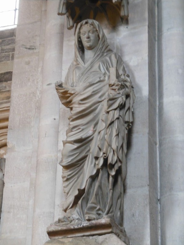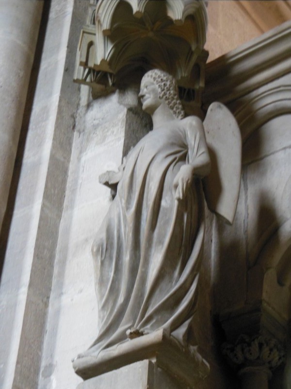 Synagoga c. 1225: she represents Judaism and the Old Testament defeated by Christianity.  She’s blindfolded and dropping  Moses’ tablets of law.  Troubling anti-Semitism aside, Synagoga is the most beautiful sculpture in the church.  Actually, with her sheer dress and dignified  stance, she’s quite sexy.