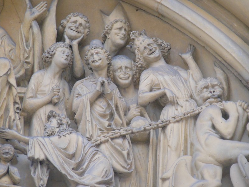 See, there’s Christ in the center, with Virgin and St. John at his feet. Some happy naked people are popping up out of graves under his feet. On the left, some annoyingly self-satisfied folks are headed to their eternal reward, on the right, well, the facial expressions say it all.