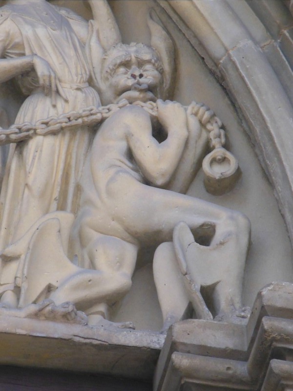 The devil with his donkey’s ears and -whoa!–wings on his calves–sticks out his tongue a he pulls a chain of the damned down, down, down.