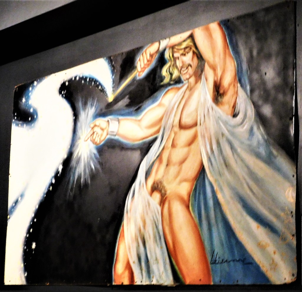 Etienne was the life partner of LA&M and IML co-founder, Chuck Renslow, so predictably his work primarily features leather-clad men with supernaturally-sized pectoral muscles and crotch bulges. Once in a while he went off script, though, and created a masterpiece like The Wizard. Hi there, Mr. Wizard, what are you pointing at with your magic blinging finger?