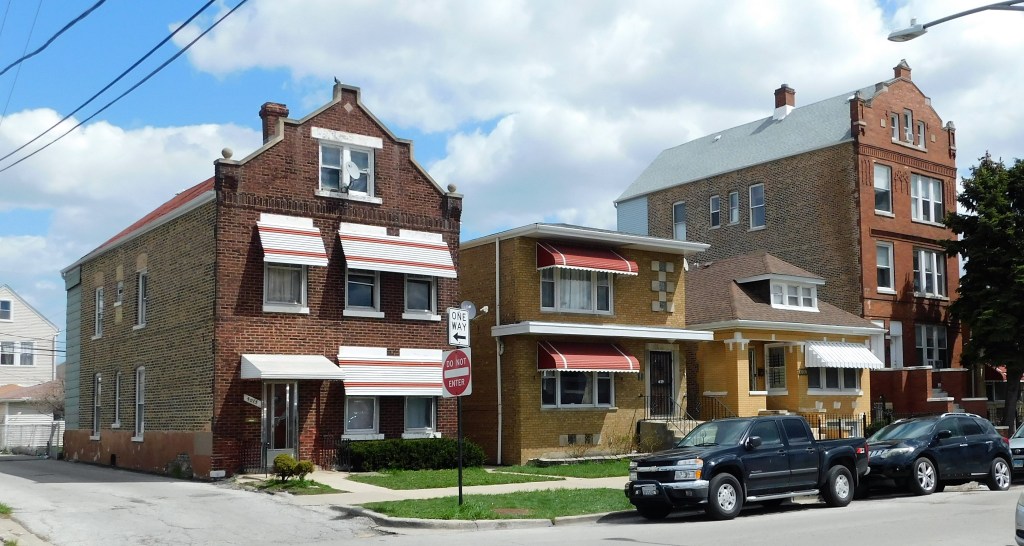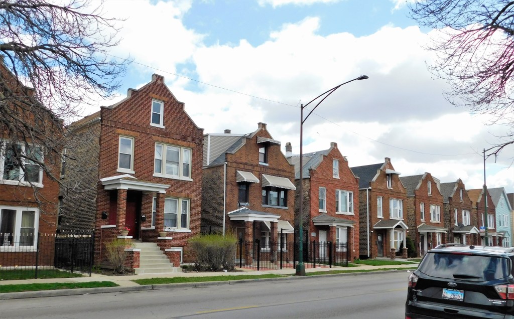 This row of brick two flats = exceptionally satisfying. I adore the Flemish rooflines and the roofed entries with their two brick pillars. This is why it is so fun to visit Chicago’s neighborhoods.