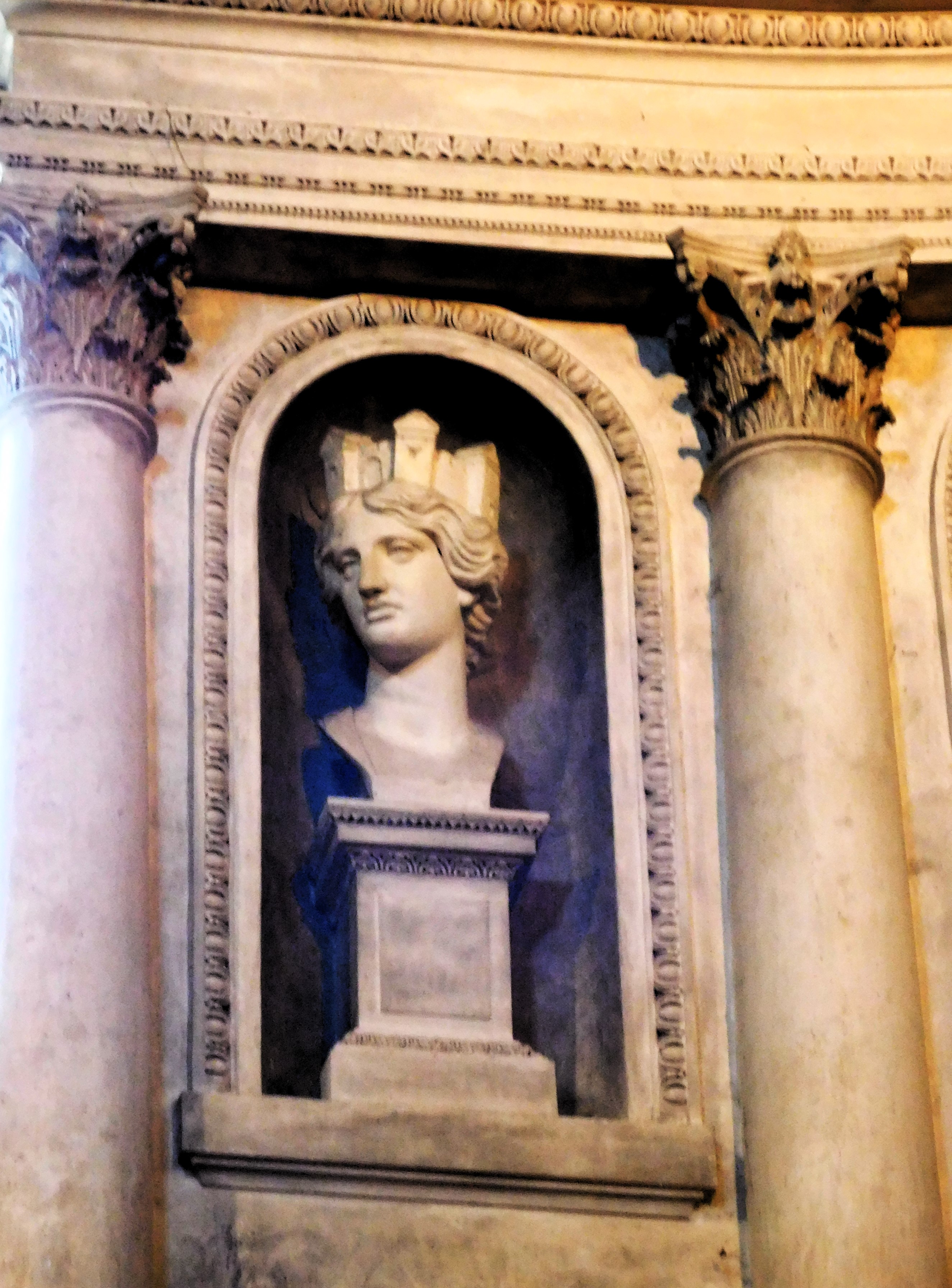 It was hard to get photos of the statuary, but there’s (naturally) a classical them. See Zeus holding up a thunderbolt? Behind the statues are paintings of people watching the play behind a trompe l’oeil balustrade.