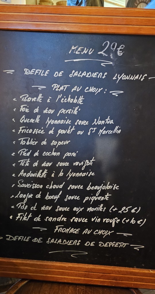 Oh, that menu! The only thing I have not eaten was andouillette…..the smell alone! You knew when it was the plat du jour the minute you opened the door….think of the odour of the drains of Calais in August which used to greet the traveller from the u.k. and you have andouillette.
