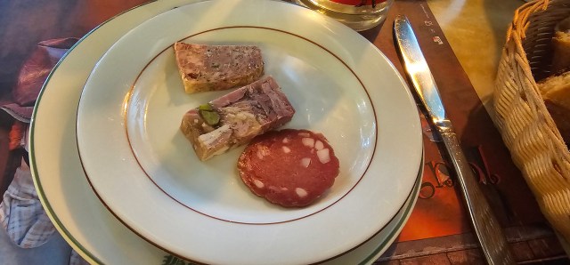 Right away the server brought out a few pâté style meats. This is the variety of food that’s always scrumptious in France—so bring on the squishy pork.