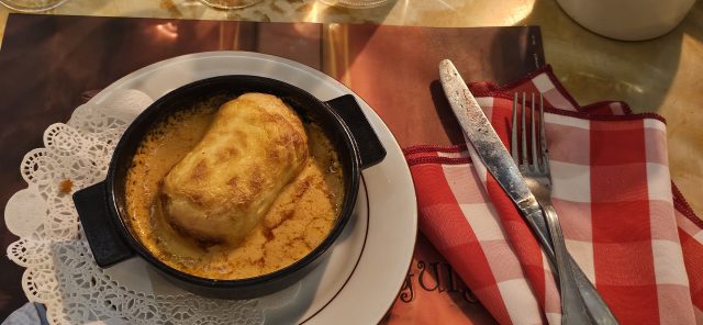 For those of you keeping track at home, I’d now eaten nine different foods and still hadn’t made it to the actual dish I ordered. Here it is, a quenelle, which is a big dumpling made of fish in a creamy-crustacean sauce. I ate ALL of it.
