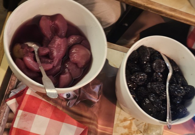 At this point in the evening, even I started to feel just a tiny bit full. Too bad, because five different desserts were about to hit the table: pears poached in wine, stewed prunes (I was cautious with these due to a previously explosive encounter), rice pudding, a creamy dessert that I forgot the name of, and a decadent carmel topped flan.