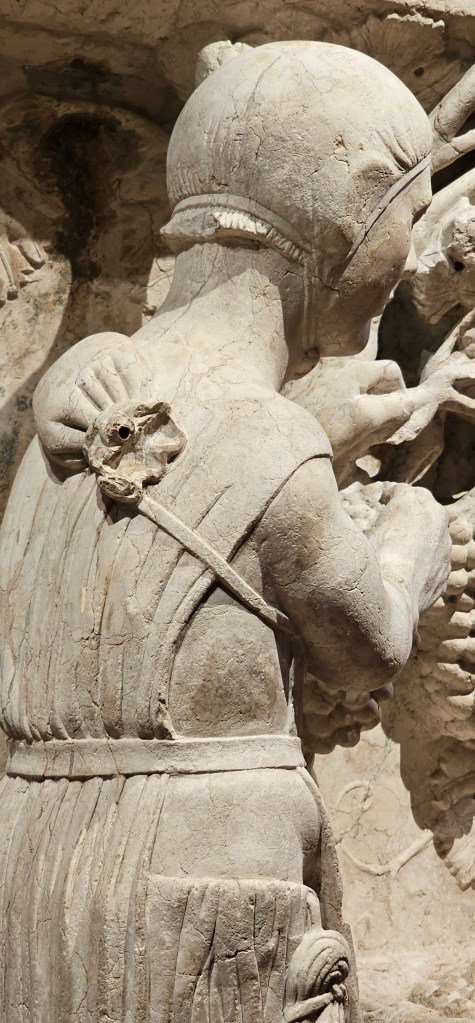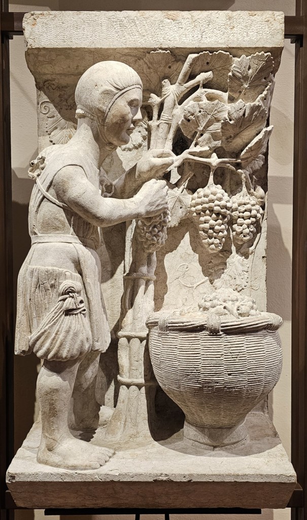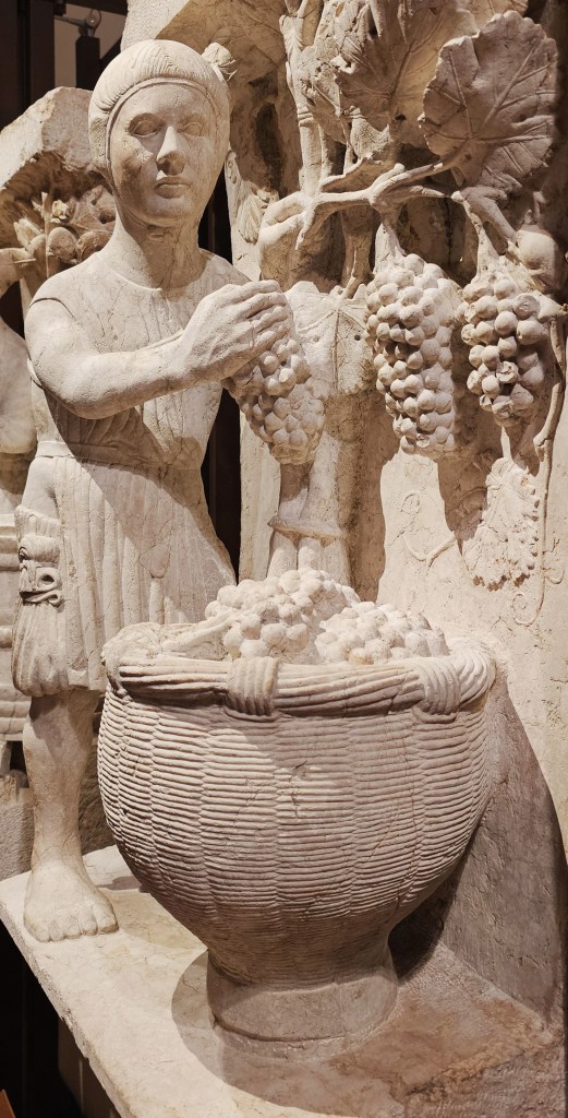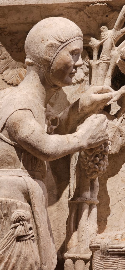 At the Cathedral Museum in Ferrara, which I visited last month when I was in Italy, I discovered this carving of a grape harvest. I don’t specifically recall costuming any plays set in a northern Italian vineyard in 1225, but if I had, surely this exquisite artwork would have been the perfect primary source.
